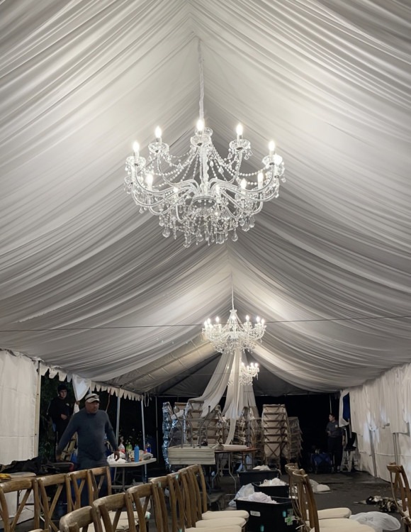 All draped tents come with (1) chandelier. (2) chandeliers are recommended for a 20x40 tent.